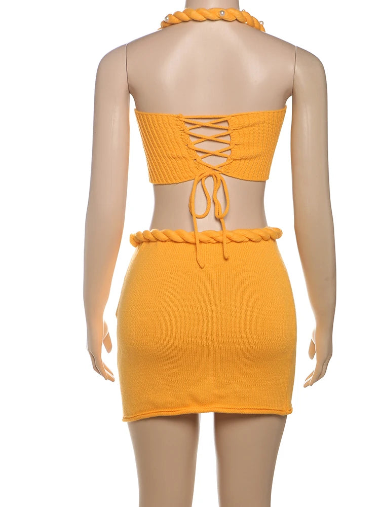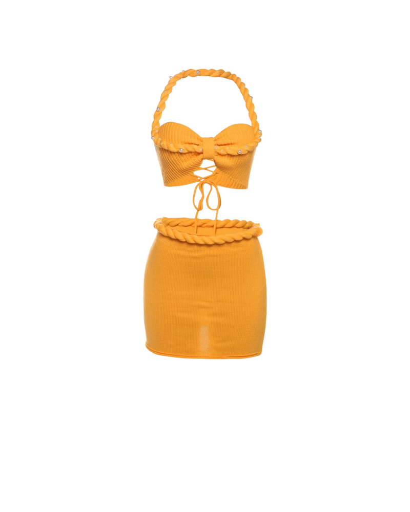 The Solene Knit Set is your new summer go-to. This two-piece outfit features a halter-style knit crop top with rope detailing that laces up in the back for an adjustable fit. The matching mini skirt includes a coordinating rope detail around the waist, pearl accents on the ties, and an edgy unfinished hem. The skirt zips up the side for an easy, flattering fit. Lightweight, stretchy, and totally ready for vacay.