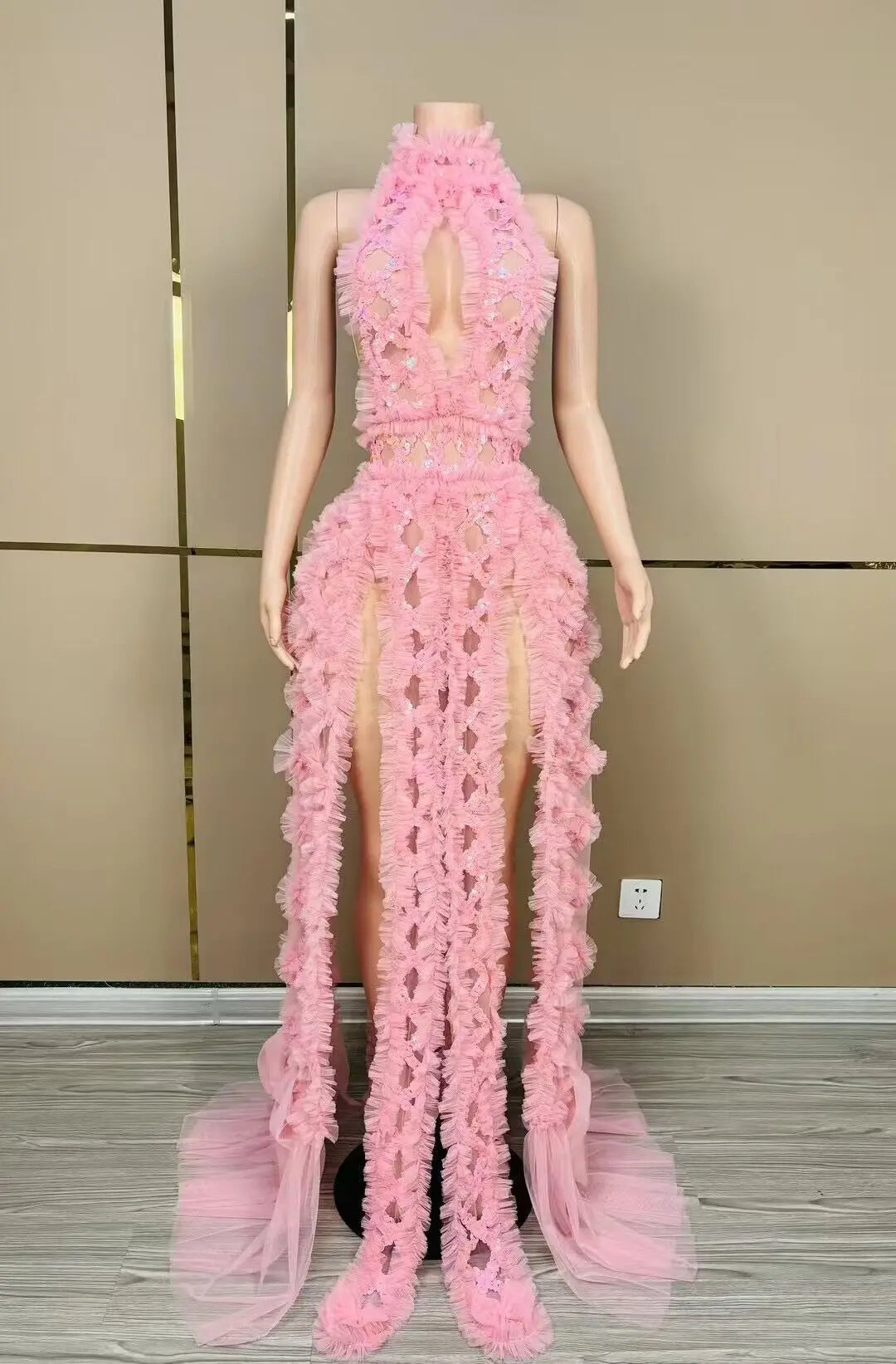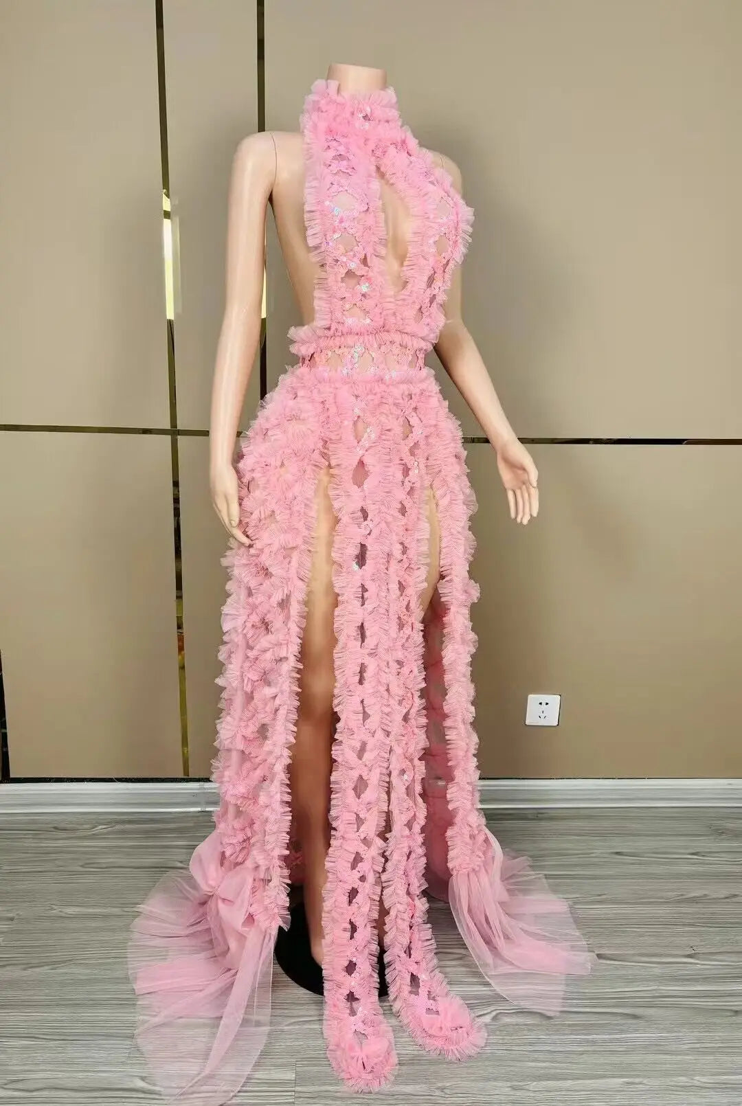 Command attention in the Aurora Sequin Gown, a dazzling floor-length masterpiece designed for those who love to make an entrance. This gown features a sultry deep V-neckline, a stunning backless design, and intricate layered sequin detailing that shimmers with every step. The sheer fabric and high slits add just the right amount of drama, while the elegant ruffle detail cascades beautifully for a show-stopping finish.