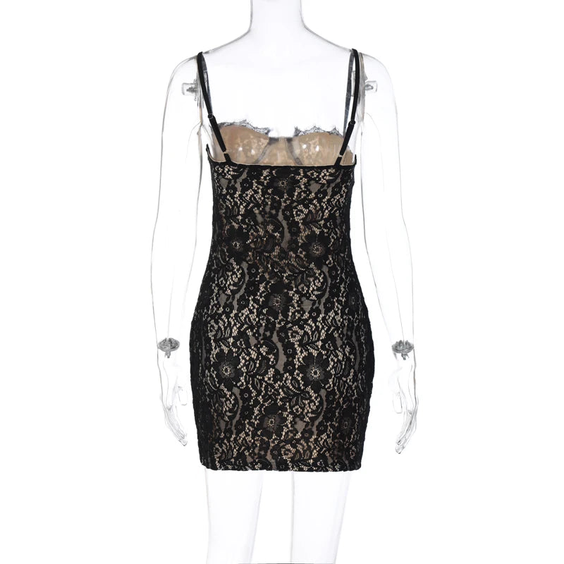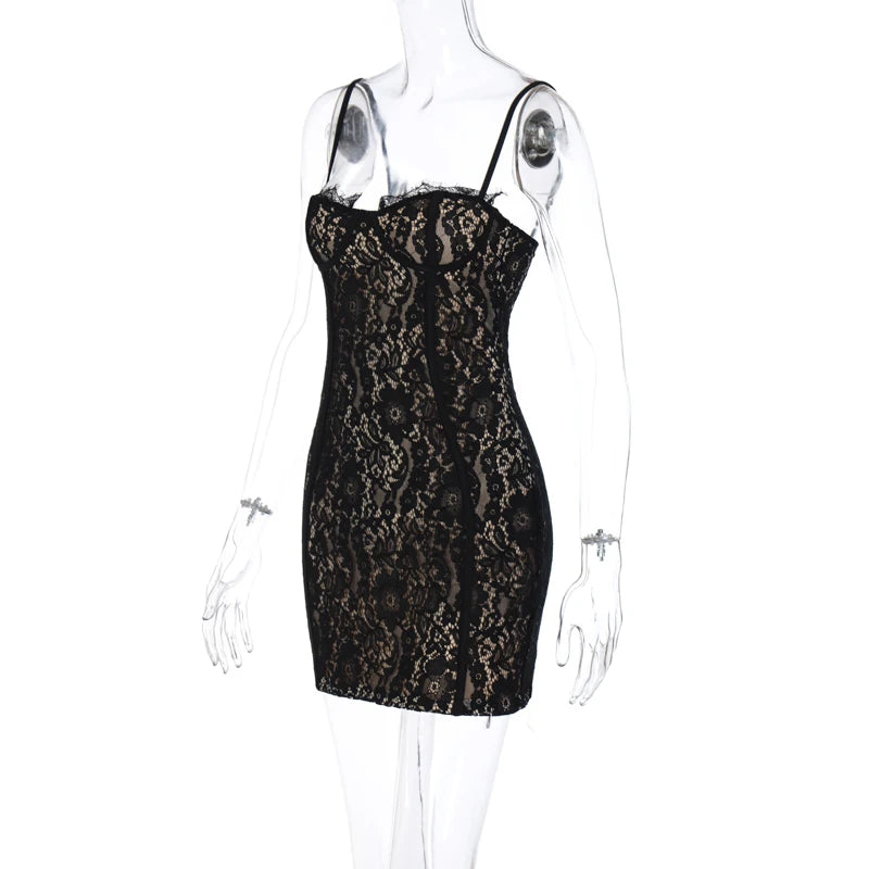 The intricate lace overlay paired with the tan-toned inside lining gives this mini dress an elegant yet sultry feel. The adjustable straps let you perfect your fit, while the side zipper ensures easy wear. Whether you’re stepping into a date night or a girls’ night out, this dress guarantees compliments.