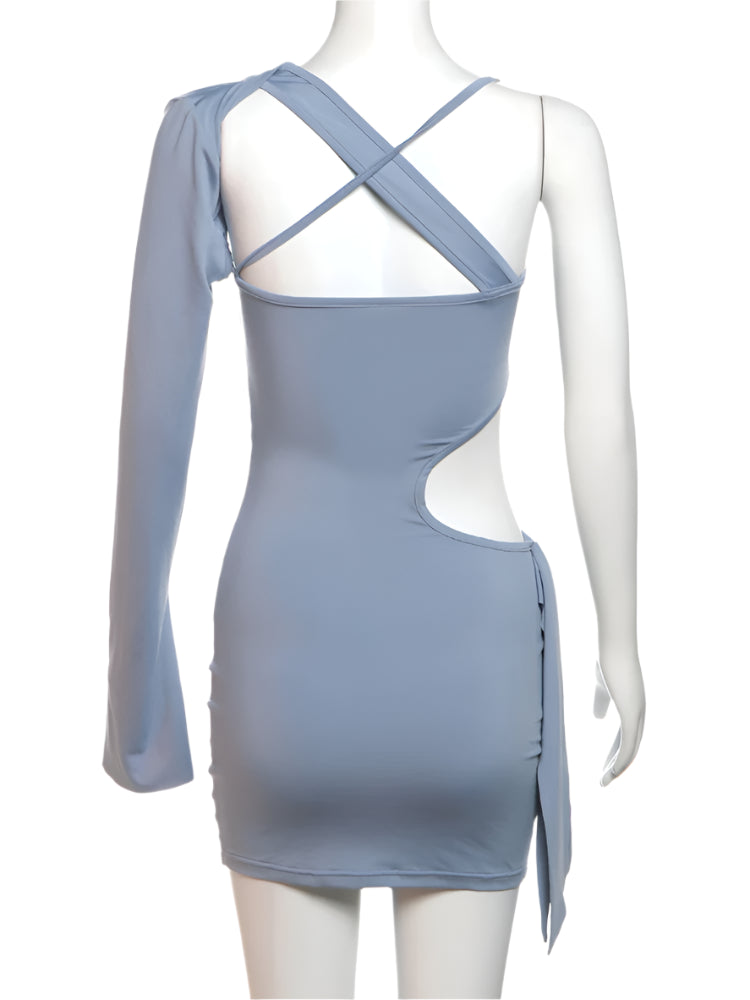 Turn heads in the Selene Dusty Blue Mini Dress, a perfect blend of elegance and edge. Featuring delicate metal circle details on the straps and a striking crisscross back, this dress is designed to make a statement. The open side adds a bold touch, while the single draped sleeve and hip drape bring sophistication. Crafted with great stretch, it ensures a figure-flattering fit for any occasion.