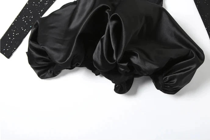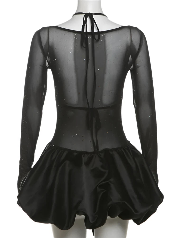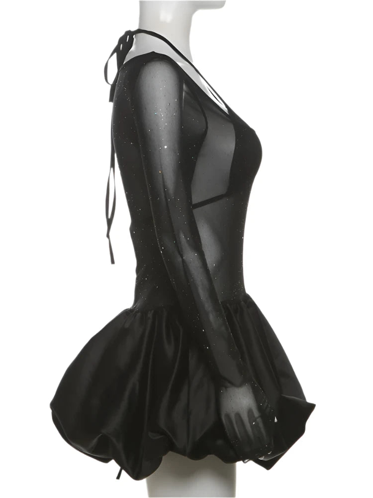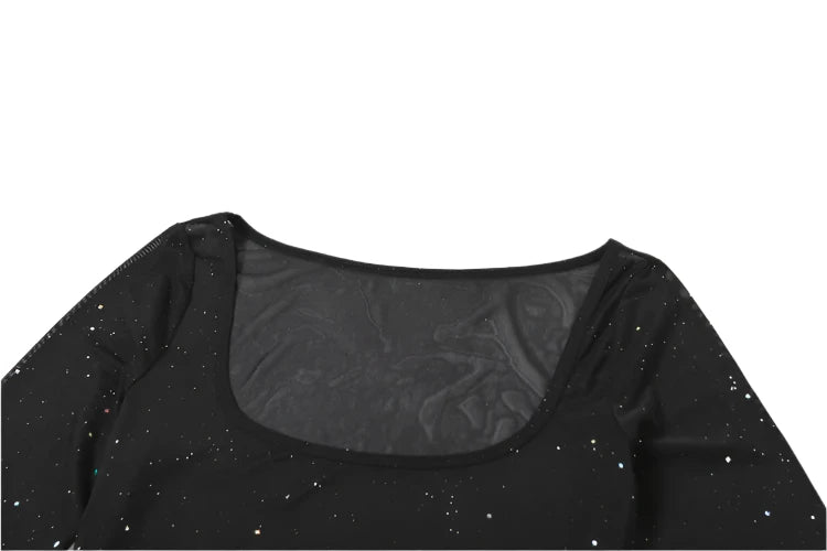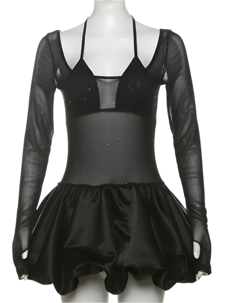 Get ready to turn heads in the Roxy Sparkle Two-Piece Mini! This stunning little black dress features a sparkling triangle tie bra top and a sleek, sheer mesh scoop neck overlay with long sleeves for an ultra-chic vibe. The silky, ruffled puff hem adds just the right touch of drama, perfect for a birthday bash, girl’s night out, or any event where you want all eyes on you. With great stretch and a flattering fit, this dress is both comfortable and unforgettable. Make a statement in the Roxy!