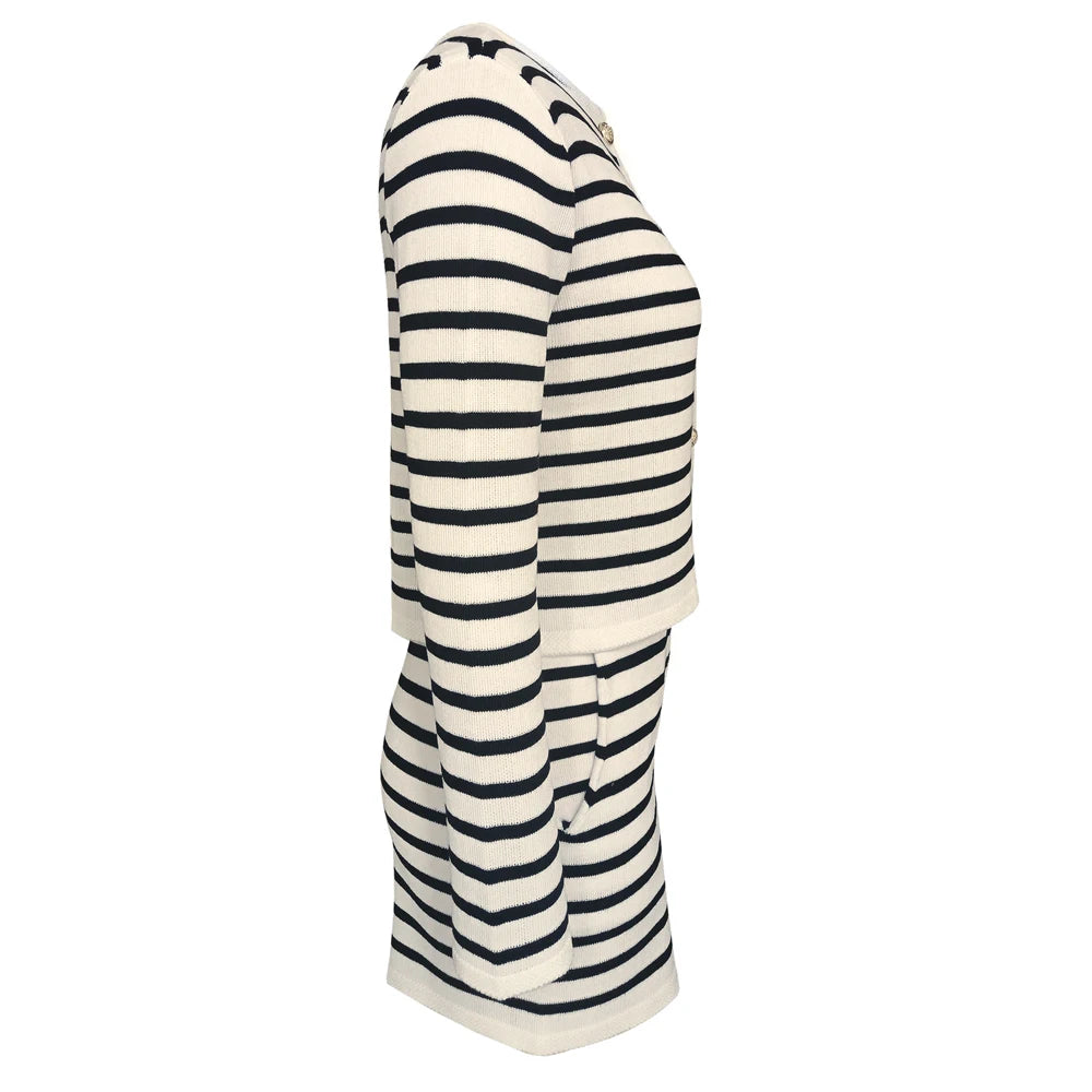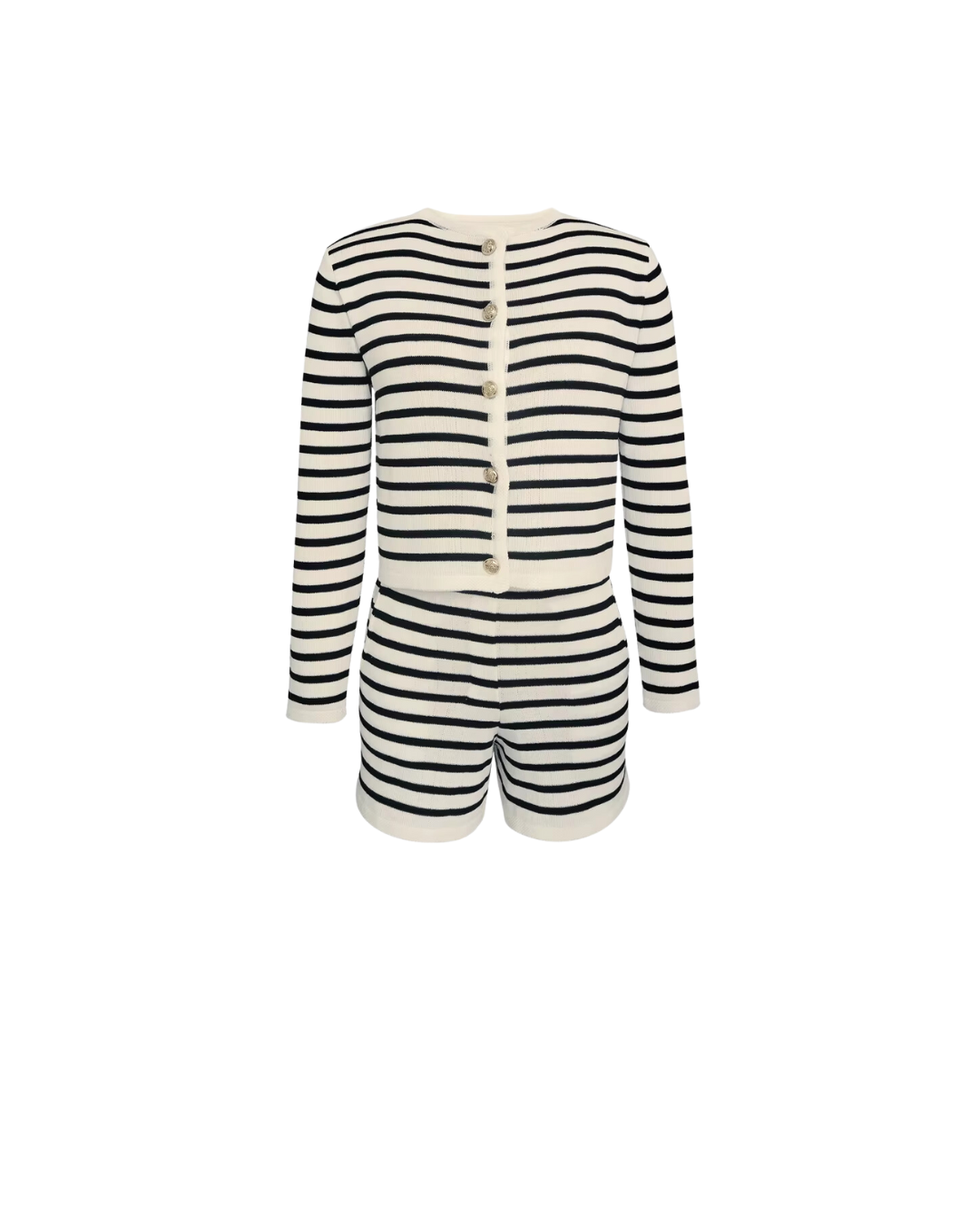 Stay comfy and stylish in the Alexandra Knit Short Set! Made with a high-stretch polyester blend, this casual set features a playful striped pattern and quirky button and pocket decorations. Perfect for any casual occasion, this set is crafted with knit weaving and an elastic waist for ultimate comfort.