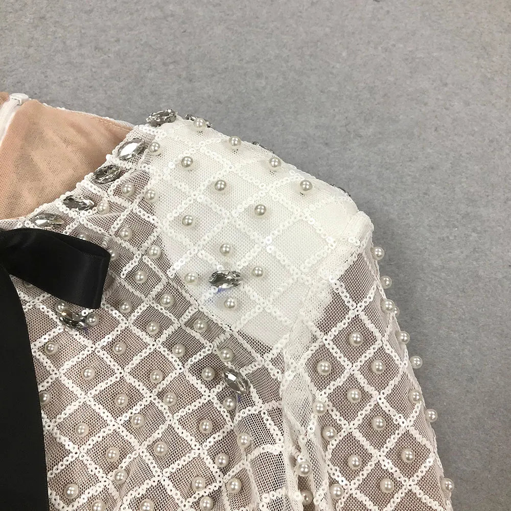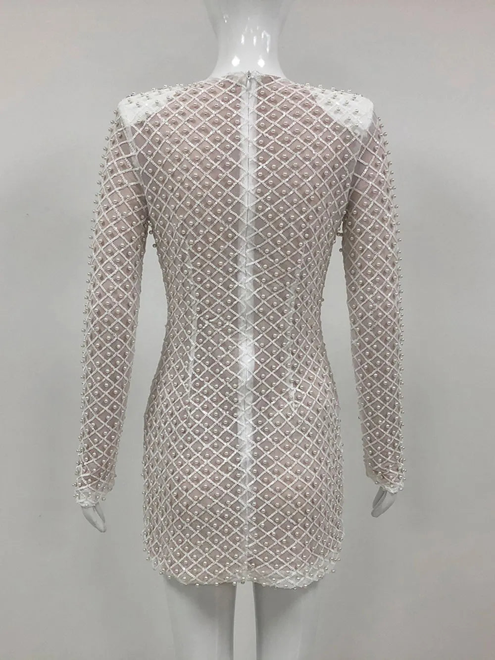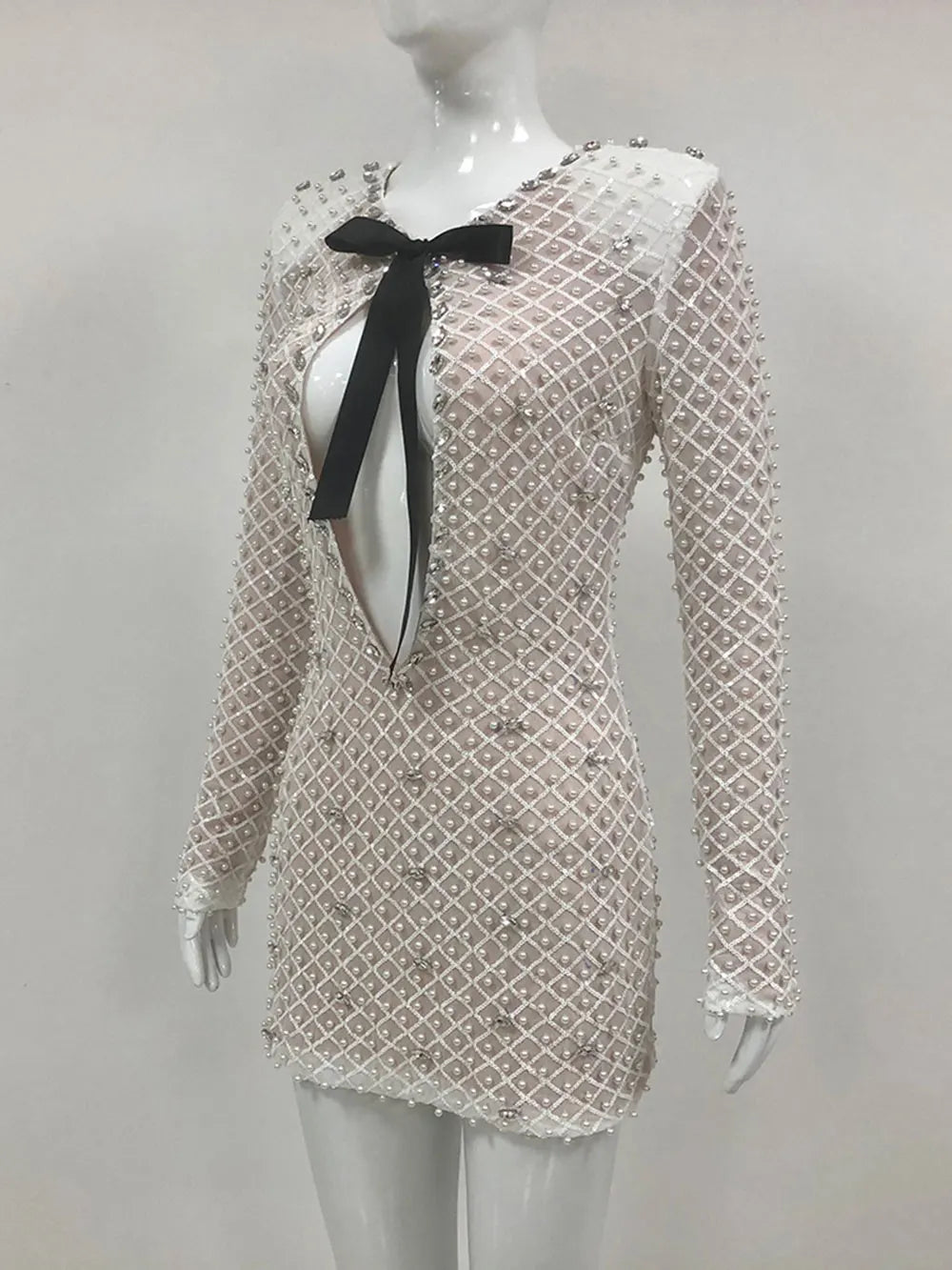 Get ready to turn heads in the Audrina Pearl Rhinestone Mini dress! This sequined stunner features an O-neck, long sleeves, and a playful cut-out and ribbon detail. The dress is embellished with pearls and rhinestones, adding a touch of elegance to the fun design. Perfect for a night out, just remember to gently dry clean it!