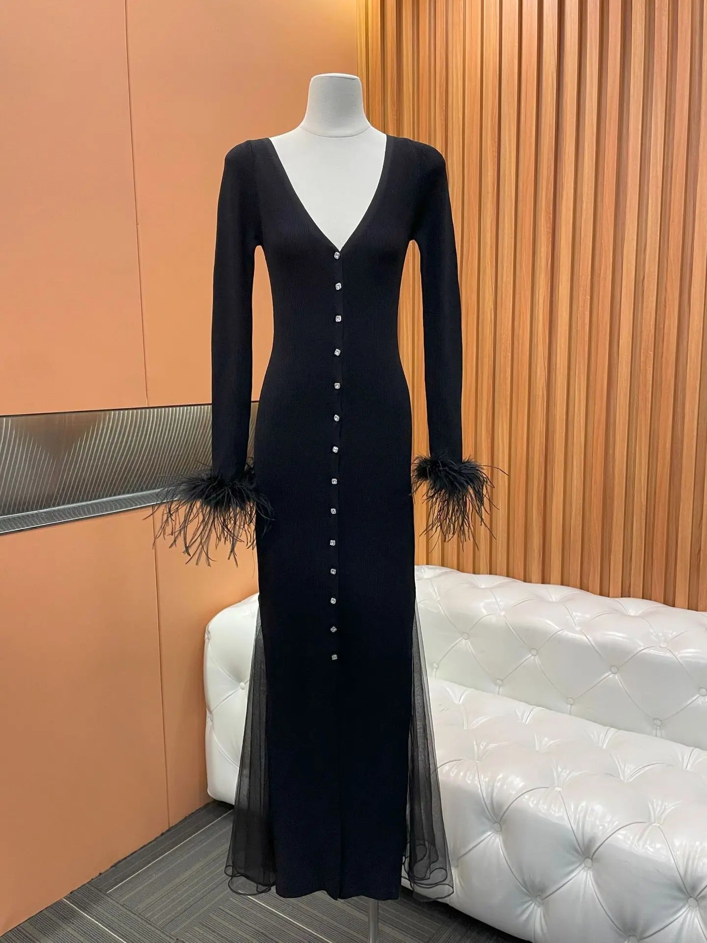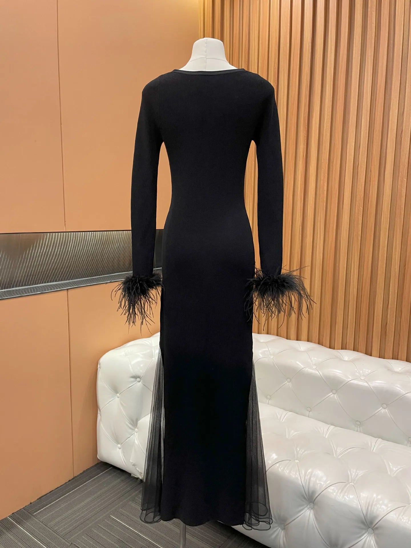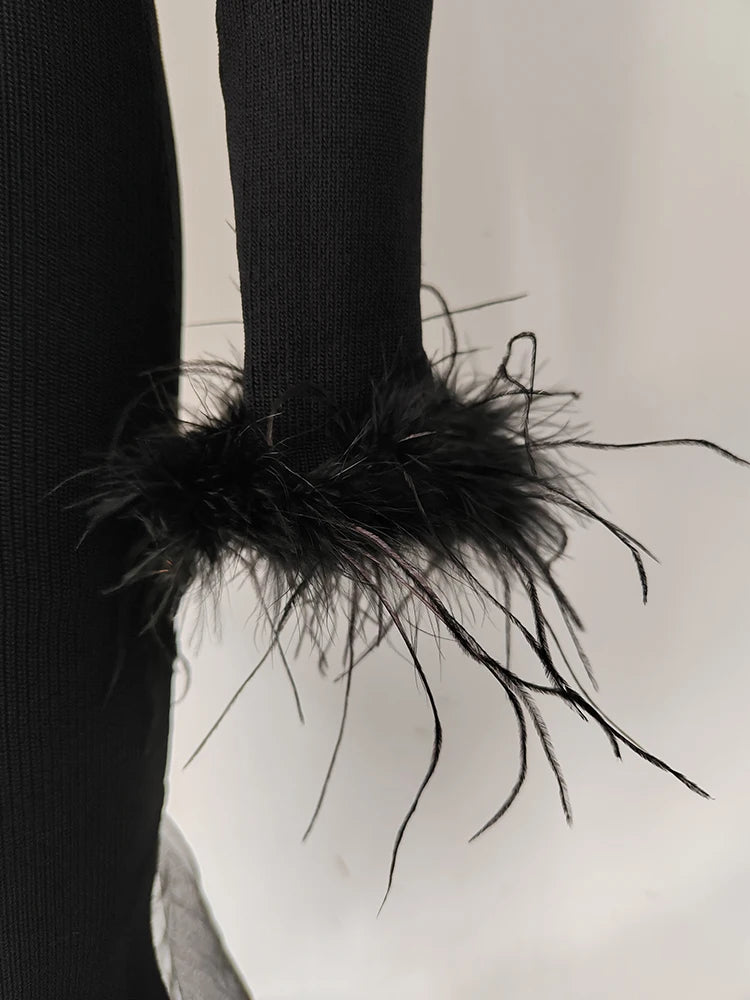 Add a touch of glamour to your formal events with our Sasha V-Neck Feather Maxi! This sleek black dress features luxurious feather cuffs and a sheer overlay for a sophisticated finish. Designed for bold, elegant style, it accentuates your curves and is available in sizes S, M, and L. (Mannequin is wearing size small).