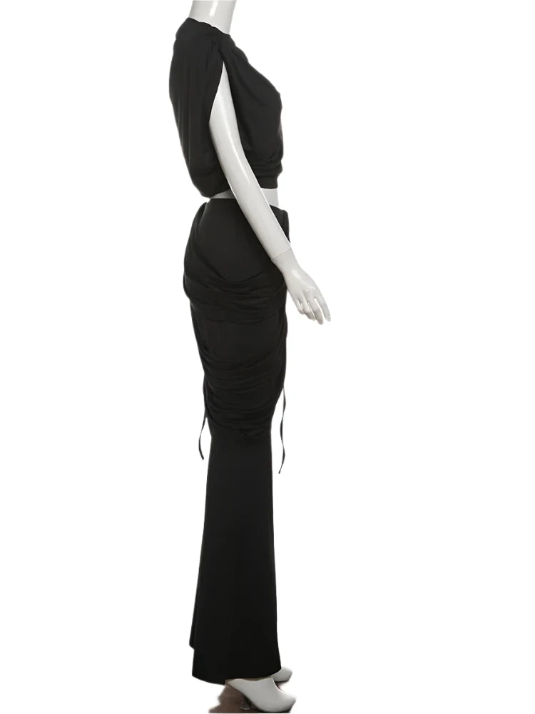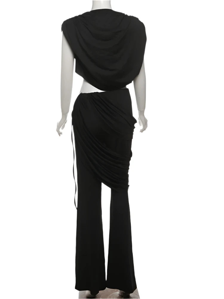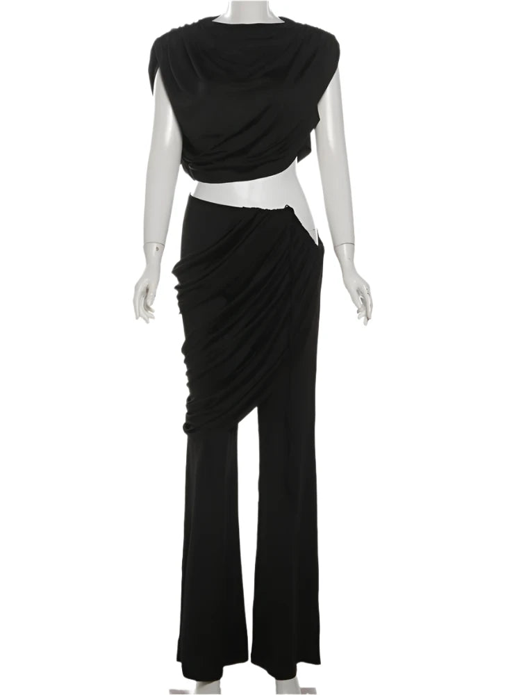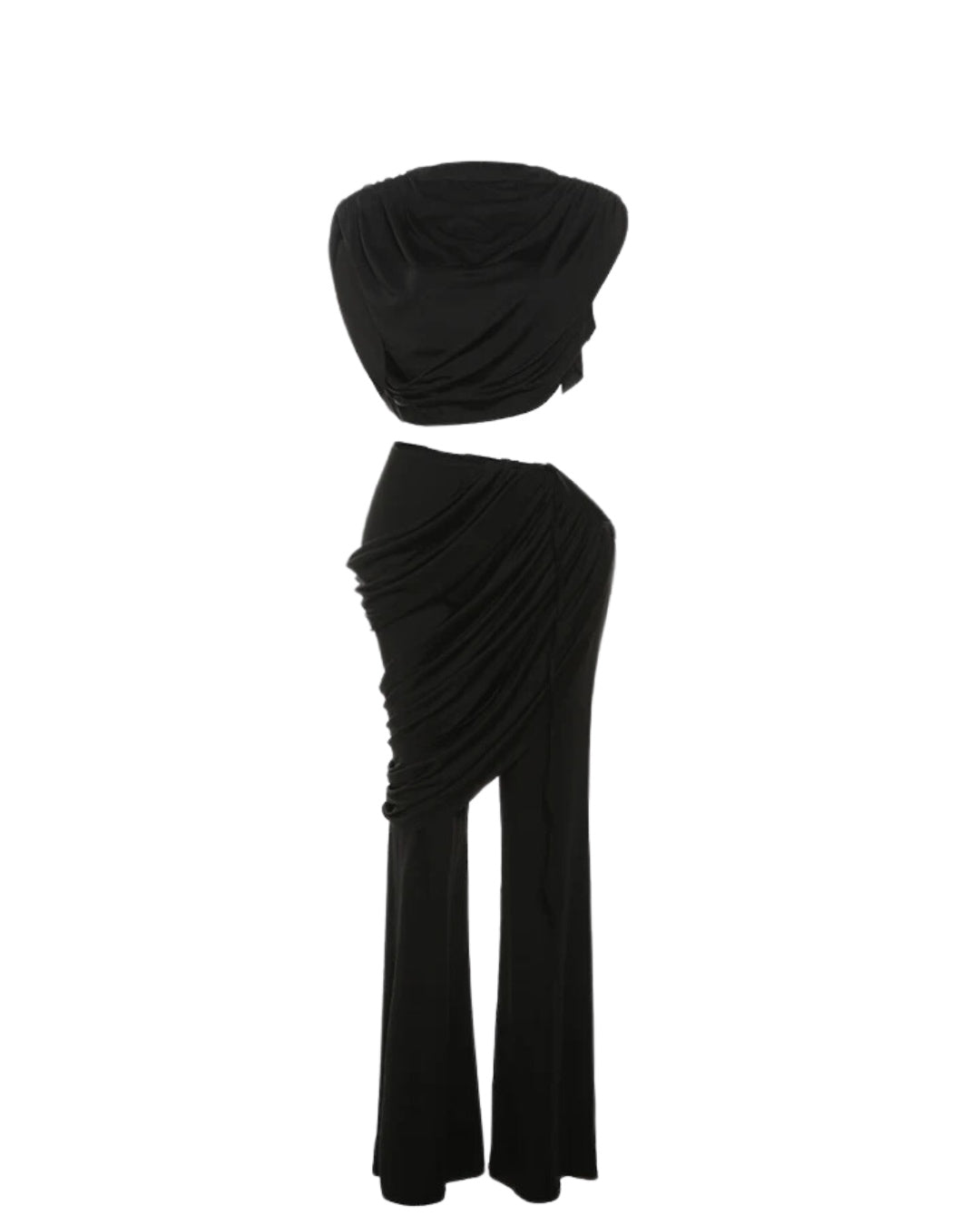 Get ready to slay in style with the Athena Ruched Two Piece set. The open hip design and draped stretchy material provide comfort as well as a flattering silhouette. The wide leg pants add a touch of chic to your look. It's the perfect combination of fashion and function.